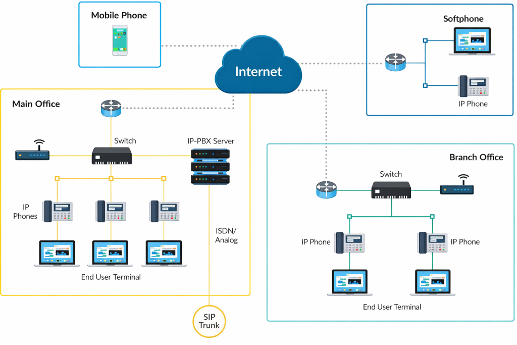 Our scalable cloud-hosted IP-PBX system does not have upfront costs of large equipment purchases. Data and phone networks are combined, allowing employees to make long-distance calls over the internet.
